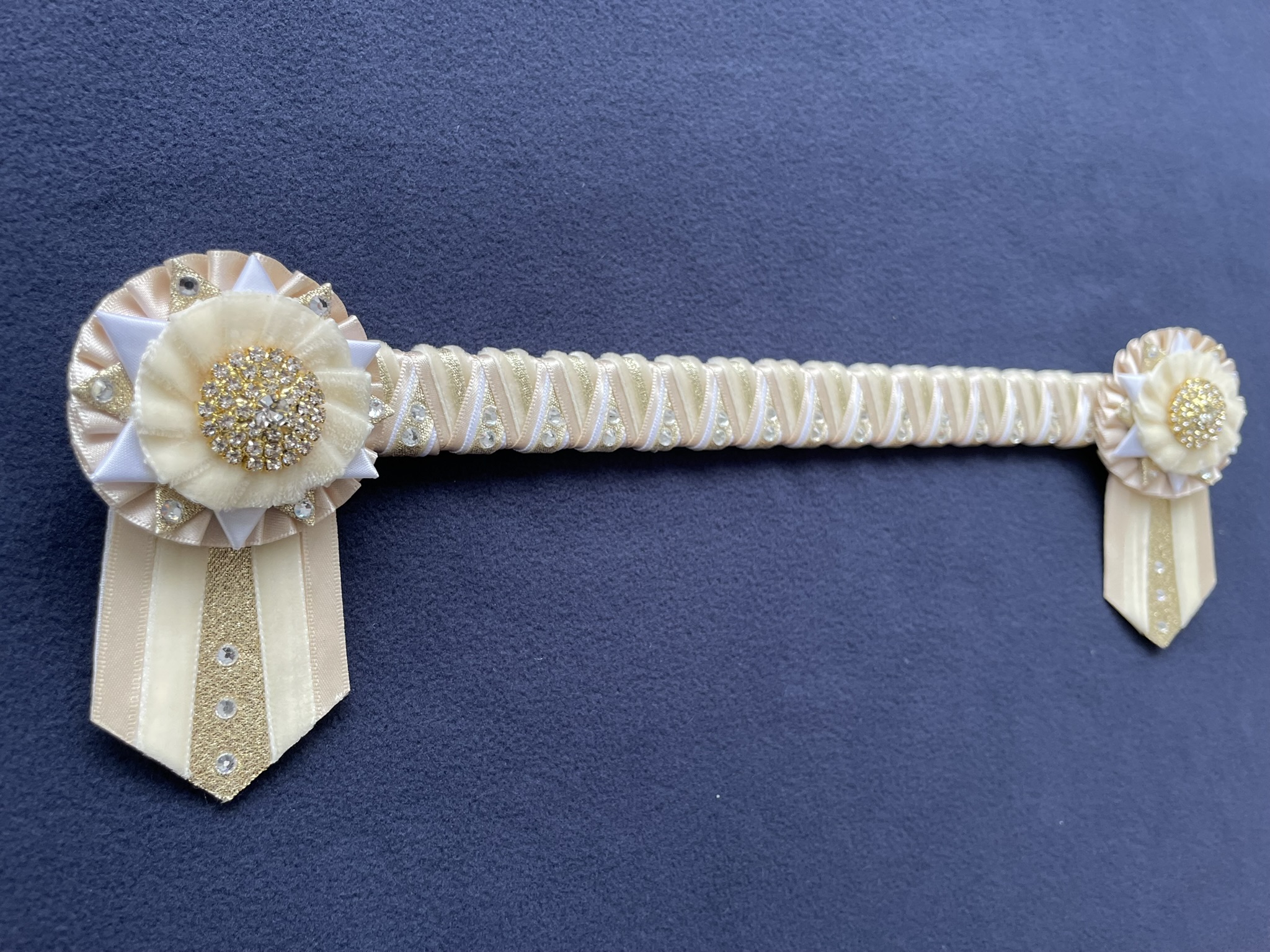 Made with cream velvet, cream satin, white satin and sparkly gold ribbons.