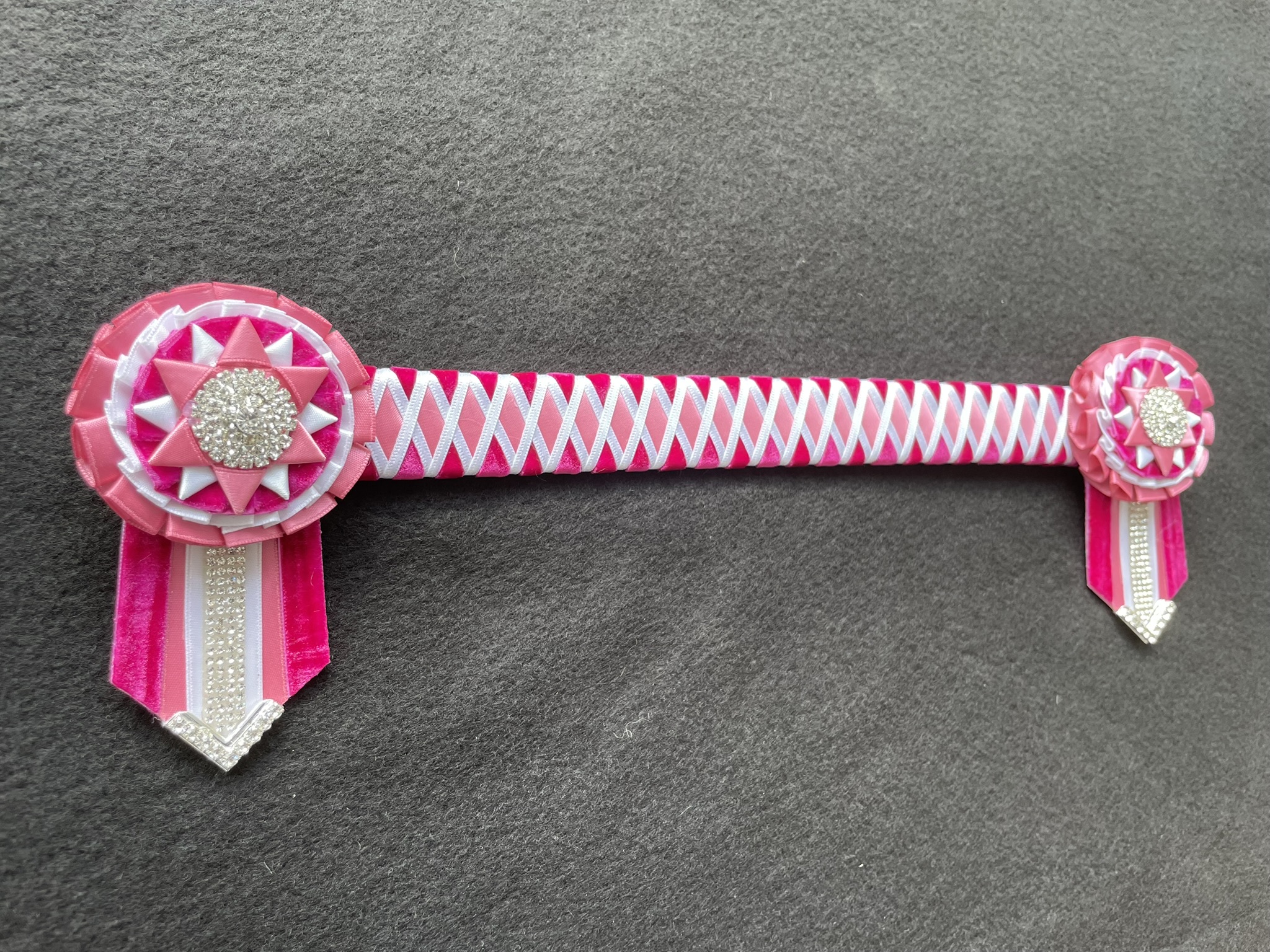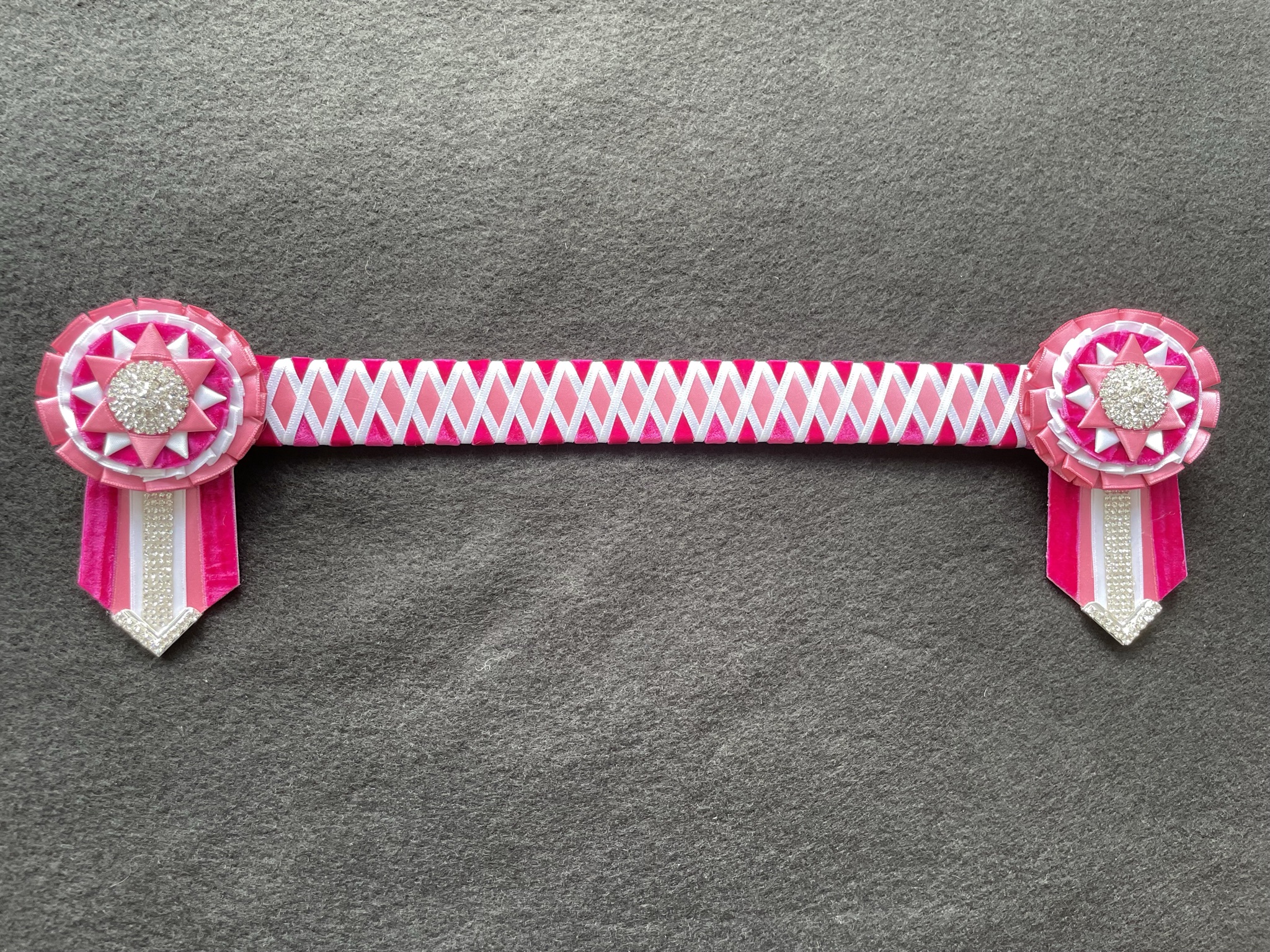 Featuring large crystal buttons on the rosettes and extra diamantes on the tails and rosettes.